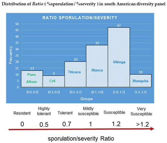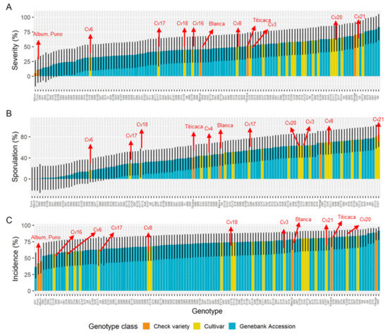 Reference cultivars’ responses to infection with Peronospora variabilis, measured in mean severity under greenhouse conditions. Source: Colque-Little et al. [52].