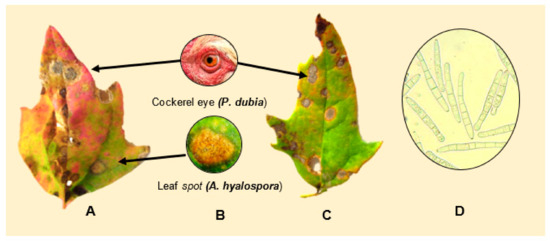 Diseases of quinoa have been reviewed previously [2,3,4,5,6]. However, an update is necessary because new emerging diseases of the quinoa mycobiome are being discovered. Taxonomy based on the morphological characteristics and nomenclature of fungi is relatively conserved and informative when high-level classifications (genus level) are considered. However, there is uncertainty when lower-level phylogenies (species level) are considered due to the fast-evolving traits and phenotypic plasticity of fungi [7]. As a result, DNA and molecular sequence-database comparisons techniques have been employed, along with various DNA fingerprinting and more advanced and complex methods such as whole-genome sequencing, for the identification of plant pathogens [8,9].
