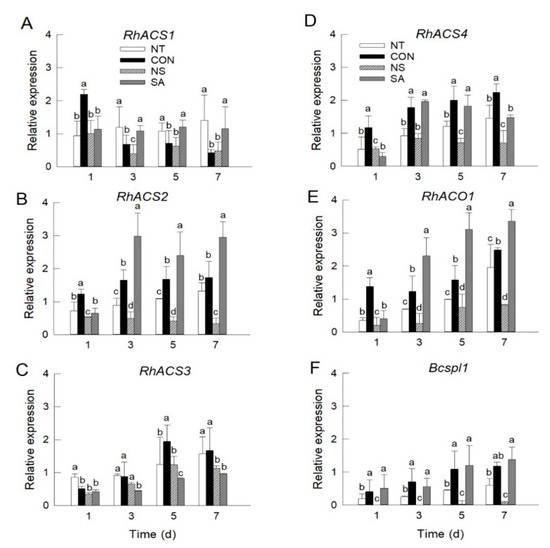 The expression of five ethylene biosynthesis genes and Bcspl1 in rose petals was detected using quantitative real time PCR (qRT-PCR) on days 1, 3, 5, and 7 after B. cinerea inoculation. The mRNA levels of three ethylene biosynthesis genes, RhACS2, RhACS4, and RhACO1 were higher in control and SA flowers than in NT and NS flowers (Figure 2B,D,E). The expression of these genes was increased in NT flowers on days 5 and 7; however, there were no changes in NS flowers during vase period (Figure 2B,D,E). The expression of RhACS3 in petals was induced in all treatments on days 5 and 7 of vase life (Figure 2C). The mRNA levels of RhACS1 were decreased in control flowers and not affected in other treatments during vase periods. However, the accumulation of RhACS1 in petals was higher in NT and SA flowers than that of CON and NS flowers on days 3, 5, and 7 (Figure 2A).