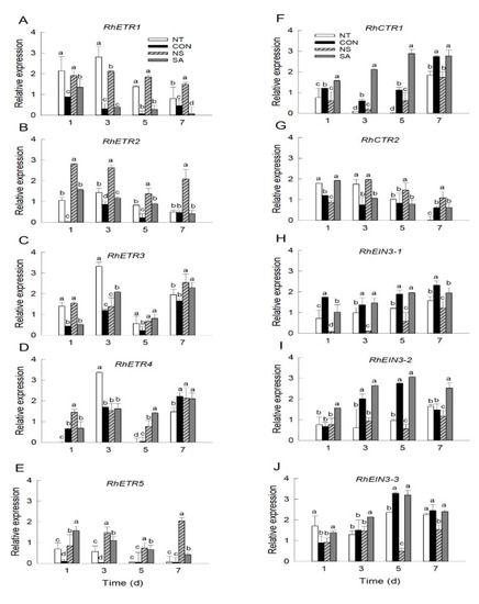 Effect of B. cinerea infection on transcript levels of ethylene receptor (A–E) and signaling (F–J) genes in petals of cut roses. mRNA levels of ethylene receptor and signaling genes were detected on days 1, 3, 5, and 7 after the transport simulation. NT, non-treated flowers; CON, flowers were held in distilled water; NS and SA, cut flowers were treated with nano silver and salicylic acid. CON, NS, and SA flowers were sprayed with B. cinerea conidial suspension to induce gray mold development. All flowers were then stored at 10 ± 2 °C and 80–90% RH in dark conditions for 4 d for export simulation. Different letters above bars indicate statistically significant differences among treatments at p = 0.05 based on Duncan’s multiple range test. Vertical bars show standard errors of the means (n = 3).