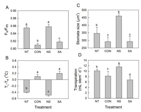 The maximum quantum yield of PSII (Fv/Fm) was measured using dark-adapted rose leaves, which were subsequently exposed to actinic light on day 1. The B. cinerea infection occurring on day 1 decreased the Fv/Fm values in the leaves of control and SA flowers (Figure 4A). The decrease in maximum quantum yield of PSII values was significantly suppressed in NT and NS flowers (Figure 4A). Under light conditions, the temperature difference between the leaf (TL) and the reference plate (TR) (TL − TR) in control and SA flowers on day 1 exhibited positive values (Figure 4B). This finding indicates that the temperature of B. cinerea-infected roses increased prior to the appearance of the visual symptoms.