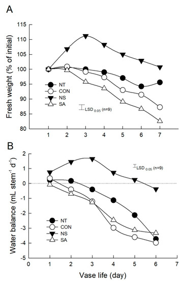 Changes in the water relations of the cut flowers were also analyzed daily to evaluate the effect of NS and SA on postharvest quality of cut flowers after B. cinerea infection. Under the light conditions, stomatal opening rate and transpiration of control and SA flowers were significantly lower than those of NT and NS flowers (Figure 4C,D). The number of days that flowers retained their initial fresh weight and positive water balance was shortest in control and SA flowers but longest in NS flowers, compared to NT flowers (Figure 5A,B). This result showed that NS not only suppressed the B. cinerea growth on cut roses but also effectively improved the water relations of cut flowers during vase period.