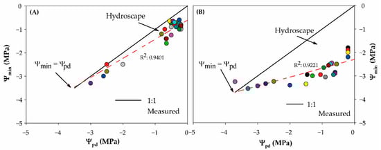 Relationship between pre-dawn water potential (Ψpd) and midday water potential (Ψmin) for the R20 (A) and S/R20 (B) Prunus dulcis cultivars. Continuous black lines represent a 1:1 line when Ψpd = Ψmin, and the dashed line represents a fitted linear regression for Ψpd vs. Ψmin. Symbols in colors represent measured values of individual plants during the SD experiments.