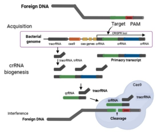 CRISPR/Cas9 expression includes effectively transcribing the large pre-CRISPR RNA (pre-crRNA) attained from the CRISPR locus, thus converting it into several crRNAs with the aid of the Cas9 protein and the tracrRNA molecule []. The tracrRNA combines with the crRNA repeat area through base complementarity and facilitates pre-crRNA processing in crRNA (Figure 2) []. The activated crRNAs join the CRISPR-associated antiviral protection complex (CASCADE) and help to identify and base-pair a particular target area of foreign DNA [].