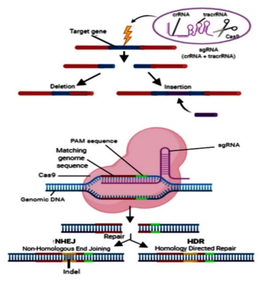 In the CRISPR/Cas9 method, DNA interference requires a single Cas9 protein []. The crRNA guides the Cas9 protein into the target site of the foreign DNA to break down during the interference step and provides immunity against pathogen attacks []. Cas9 is an immense protein with several domains (the amino terminus RuvC domain and the centrally-located HNH nuclease domain) and two short RNA segments, namely, crRNA and trans-activating crRNA (tracrRNA). The Cas9 protein promotes adaptation, engages in pre-crRNA processing toward crRNA, and implements specified DNA double-strand breaks (DSBs) led by the tracrRNA and RNAse III-specific double-stranded RNA []. The creation and development of CRISPR/Cas9 structures are relatively simple, affordable, and without intellectual property obstacles. The CRISPR/Cas9 tool, crRNA, and tracrRNA components can be fused together into the sgRNA that guides Cas9 to implement the targeting of specific DSBs (Figure 2) []. The design of sgRNAs is also straightforward, thus favouring genome-editing. The CRISPR/Cas9 method was initially designed to cause cleavage in DNA in vitro at different sites [,]. This method has recently been implemented to edit genomes in bacteria, fungi, viruses, yeast and many other organisms for successful selective mutagenesis [,,,].