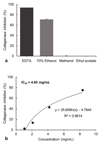 (a) Inhibitory effect of the 70% ethanol, methanol, and ethyl acetate extracts of P. formosum against collagenase activity in the preliminary screening. The final concentration of tested samples was 8.33 mg/mL. The EDTA at 1.49 mg/mL was used as the control. The results are expressed as the mean ± standard deviation of 70% ethanol (n = 4), methanol and ethyl acetate (n = 2) (data was significant as p < 0.05). (b) Concentration-response effect and IC50 determination for the 70% ethanol extract against collagenase activity.