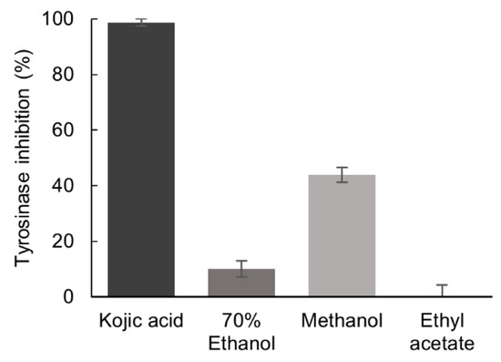 Inhibitory effect of the 70% ethanol, methanol, and ethyl acetate extracts of P. formosum against tyrosinase activity. The final concentration of tested samples was 5.33 mg/mL and for kojic acid 0.04 mg/mL. Results are expressed as the mean ± standard deviation (n = 3) (data was significant as p < 0.05).