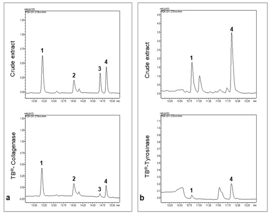 UHPLC chromatograms of the crude extract of P. formosum and the Target binding® sample. All chromatograms were acquired at 270 nm. (a) UHPLC chromatograms of the 70% ethanol crude extract and collagenase Target binding® sample. (b) UHPLC chromatograms of the methanol crude extract and tyrosinase Target binding® sample.
