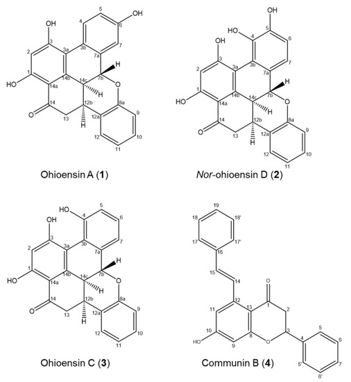 Compound 2, a new benzonaphthoxanthenone, was also isolated from P. formosum and the HRMS indicated the molecular formula C23H16O6 (m/z 389.1020 [M + H] + and 387.0880 [M − H] −) with UVλmax at 268 and 345 nm (Supplementary Figure S8). Comparing the structure elucidated from the NMR data of compound 2 (Figure 4 and Supplementary Figure S2 and Table S2) with that of ohioensin D [4] reveals that the new structure carries a OH group at C3 instead of a methoxy group which is present in ohioensin D. This is further supported by a similar chemical shift of C3 to that found for the OH substituted C3 of compounds 1 and 3. The structure is also supported by the similarity to compounds previously isolated from Polytrichum [4,5,6]. Thus, compound 2 is a new ohioensin isolated from P. formosum and suggested to be named nor-ohioensin D.