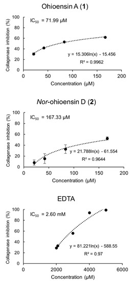 Collagenase inhibitory activity of compounds 1 and 2, and the positive control, EDTA, with their corresponding IC50 values are shown. Results from compounds 1 and 2 are expressed as the mean ± standard deviation (n = 4).