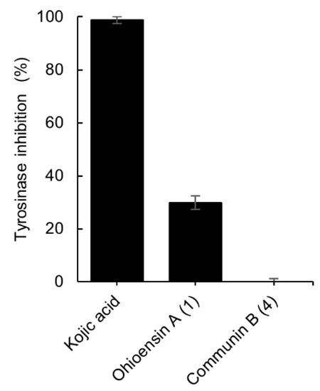 Tyrosinase inhibitory effect of compounds 1 and 4, and the positive control, kojic acid. The final concentration of 1, 4 was 200 µM and for kojic acid 300 µM. Results are expressed as the mean ± standard deviation of 1, 4 (n = 4) and kojic acid (n = 3).