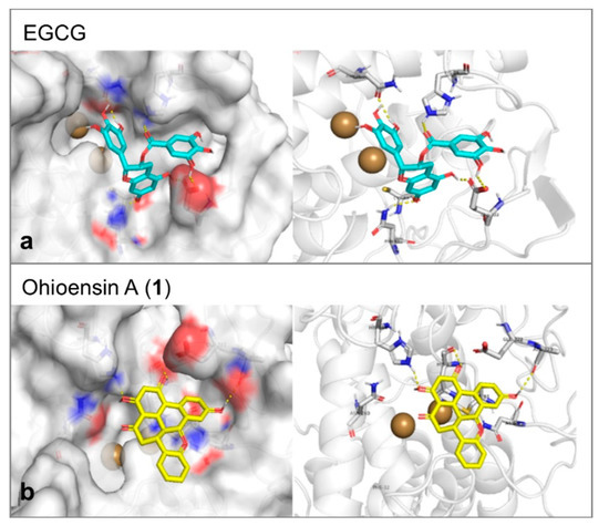 Tyrosinase enzyme was found in the protein database as apoenzyme. Therefore, a known inhibitor was selected as a docking reference to generate the parameters that would be applied in the molecular docking trials. The docking was performed inside the Cu ions containing binding cavity and the inhibitor of choice was EGCG [28]. The molecular docking affinity of it reflected its proven activity. It represented a good reference as it formed six hydrogen bonds with Glu322, Asn81, Cys83, His244, and Asn260 of the tyrosinase-binding site (Figure 8a). This large number of hydrogen bonds was additionally expressed in a stable interaction of binding energy equal to –8.2 Kcal/mol. Compound 1 formed three hydrogen bonds with Ala323, His244, and His85 and showed moderate affinity of –7.1 Kcal/mol toward tyrosinase (Figure 8b).