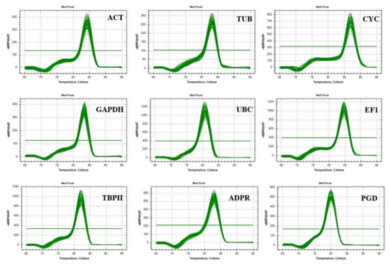 Melt curve analysis of the nine reference genes revealed that in every case a single peak was observable under different abiotic stresses in both oat genotypes, and the amplification curves showed good repeatability (Figure 2), which means that the primers amplified a single PCR product. Therefore, they are appropriate for detailed RT-qPCR studies.