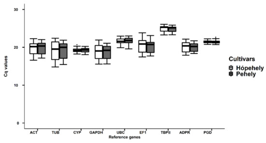 Cq values of the nine reference genes in all oat samples are shown in the boxplot (Figure 3). Comparing the Cq value ranges for the two investigated cultivars shows they are very similar for a certain reference gene. The range of Cq values in all samples varied from 14.83 to 26.54, which shows that the mRNA transcript levels of the reference genes were high enough for gene expression analysis (<35). However, Cq values were influenced by treatments, tissue type, and in some cases by genotype, so it was necessary to analyse them under different circumstances.