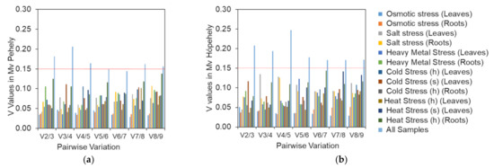 Pairwise variation measurement of candidate reference genes in the two oat cultivars: (a) V values in Mv Pehely; (b) V values in Mv Hópehely. The two types of growing media are indicated with h (hydroponic) and s (soil).