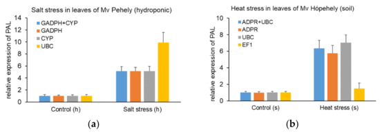 The relative expression level of PAL (phenylalanine ammonia lyase) was used to validate the candidate reference genes in our study. PAL is one of the key enzymes during the synthesis of the well-known stress hormone, SA [22]. Elevated PAL activity or mRNA level was found in different plant species after exposure to various abiotic stresses [23,24,25]. The relative expression level of PAL was normalized with the two most stable reference genes and the least stable reference gene in oat according to the applied stress factor. Reference genes were carefully chosen after comparing the results of different evaluation programs while taking into account the effects of genotype and tissue type as well. As shown in Figure 5A, in response to heat in the leaves of Mv Hópehely growing in soil, the relative expression of PAL increased significantly, when using the most stable reference genes (ADPR + UBC), while the relative transcript level did not reach a two-fold increase when using the least stable reference gene, TUB. When applying salt stress in the leaves of Mv Pehely hydroponically (Figure 5B), a five-fold increase was measured when applying the most stable reference genes alone or in combination (GAPDH + CYP), but the relative expression level was overestimated, when UBC was used as a reference gene. In conclusion, if the applied reference gene has very high stability, one gene is sufficient for normalisation. The relative expression values of PAL in all tested tissues and genotypes under different abiotic stresses are available in Supplementary Figures S1–S4.