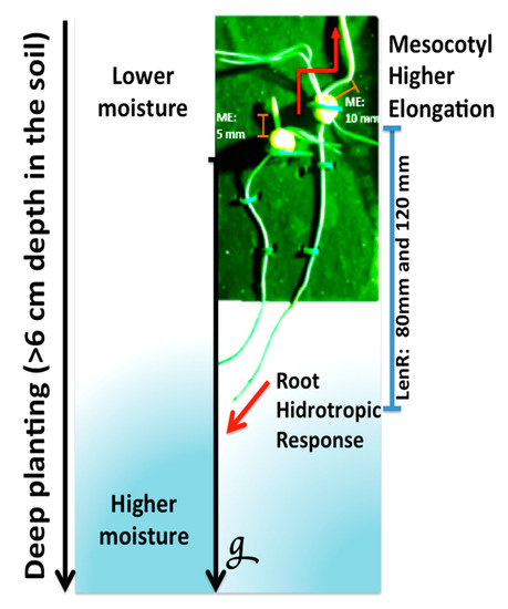 Establishment of maize seedlings when utilizing deep planting as an agricultural practice. Elongation of the roots (positive gravitropic and hydrotropic response) and mesocotyl allows the exploration of a wide area of soil by helping to forage water, which ultimately favors early seedling vigor (g: gravity; LenR: root length of 80 and 120 mm, ME: mesocotyl elongation of 5 mm and 10 mm).