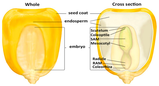 Maize kernel structure. The mature maize kernel consists of multiple tissues and organs within the embryo and endosperm, in addition to maternally derived structures. © 2013 Encyclopedia Britannica, Inc., modified image. (RAM: root apical meristem; SAM: shoot apical meristem).