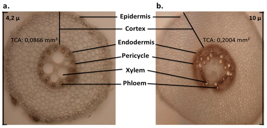 Cross-sections of primary roots of maize breed B73 at 7 days post germination. (a) Anatomy of primary root (10×); (b) anatomy of mesocotyl (10×). The lines indicate major structures. (TCA: total cortex area, RootScan®).