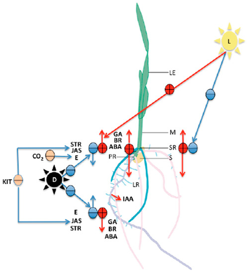 Diagram that shows the main effects of hormones on seedlings traits. (IAA: indole-3-acetic acid, ABA: abscisic acid, GA: gibberellins, E: ethylene, STR: strigolactones, JAS: jasmonates, BR: brassinosteroids, KIT: cytokinins). Their function in relation to growth and development of both the roots (PR: primary root, SR: seminal root, LR: lateral roots) and the mesocotyl (M). (S: seed, LE: leaves, CO2: carbon dioxide, D: dark conditions, L: light). Red circles with lines indicate a positive stimulus and its direction; blue circles with lines indicate a negative stimulus and its direction; nude circles indicate a negative stimulus.