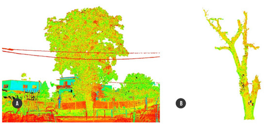 Point cloud model created in HDS Cyclone: (A) tree with surroundings; (B) separate tree structure ready for conversion to 3D-CAD.