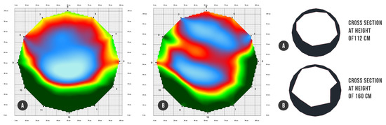 Vectorization of acoustic tomography images of decayed places into closed polylines. Color scheme of tomograms: green (intact wood), red (decayed wood), and blue (cavity or decay): (A) cross section at height of 112 cm; (B) cross section at height of 160 cm.