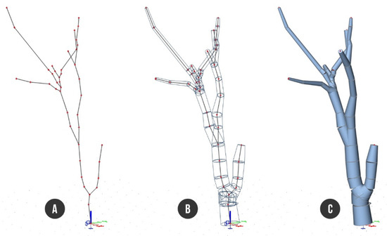 Finite element model of a tree in SCIA 20: (A) axial skeleton—beams connected by nodes; (B) cross sections of beams—non-prismatic cylinders; (C) rendered surface model.