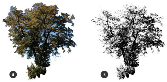 Crown transparency estimation: (A) RGB image of the tree crown trimmed by outline; (B) RGB image converted to black and white by Phyton script with black to white (transparency) ratio calculation.
