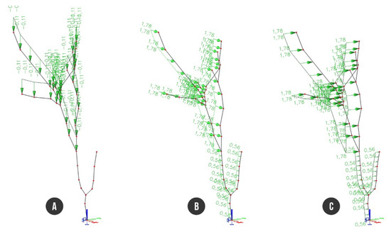 Finite element model of tree with load applied to branches and trunk: (A) foliage self-weight of branches; (B) static wind load along the X axis; (C) static wind load along the Y axis.