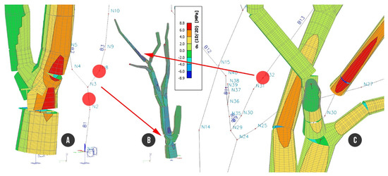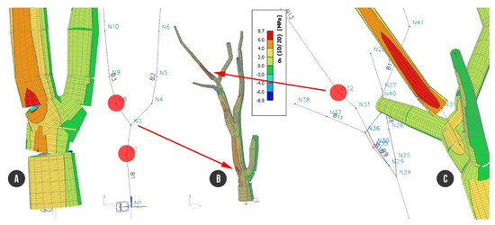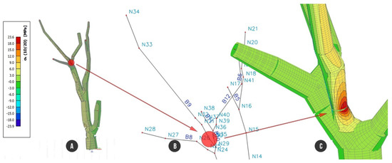 Tree structure with analyzed stress under load combination C2: (A) detailed view of trunk; (B) entire tree structure; (C) node N32 with the highest tensile stress of +8.8 MPa.