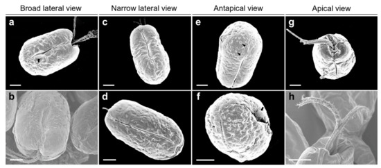 Micrographs of Tetraselmis jejuensis obtained using scanning electron microscopy. (a,b) Broad lateral views of cells showing depressions on the apical side. Distinct creases in the middle, and a regular subunit pattern (black arrow) on the cell surface adjacent to the middle furrow were observed. (c,d) Narrow lateral views of cells containing deep folded lines in the middle. Depressions were obscured from the apical peaks. (e,f) Antapical views of cells showing granular scales on the surface (black arrowheads). A regular subunit pattern was exhibited on the surface near the furrow (black arrow). (g,h) Apical views of the cells showing four flagellar hairs in 2 opposite pairs. Scale bars = 2 µm.