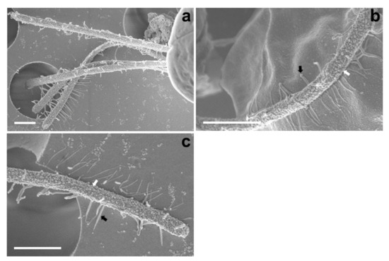 Micrographs of the flagella in Tetraselmis jejuensis obtained using scanning electron microscopy. (a) Four flagella were observed at the bottom of the cell body. (b,c) Structure of the cell flagella; microtubules showing thick, rod-shaped, and blunt-ended stalks (white arrows) and thin pit hairs (black arrows). Scale bars = 1 µm.