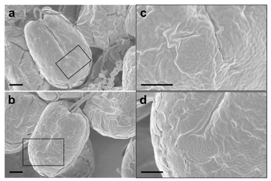 Regular subunit patterns and honeycomb-like structures observed in SEM micrographs of Tetraselmis jejuensis. (a,b) The unique patterns are observed in the broad lateral views. (c,d) Magnified views of regions highlighted by black squares in the adjacent panels. Scale bars = 2 µm for (a), (b). Scale bars = 1 µm for (c,d).