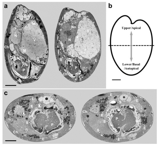 Micrographs of Tetraselmis jejuensis obtained using transmission electron microscopy. (a) Longitudinal sections showing several organelles inside the protoplasm, including chloroplasts (Ch), eyespot granules (E), mitochondria (M), nucleus (N), nucleolus (No), pyrenoid (P), starch (S), and vacuoles (V). The pyrenoid was invaded by both cytoplasmic channels comprising electron-dense material separated from the cytoplasm and canaliculi traversing it in opposite directions (black arrow). (b) Schematic drawing of longitudinal section indicating the upper/apical and lower/basal/antapical positions. (c) Transverse sections showing the position and structure of chloroplast (Ch), eyespot granules (E), pyrenoid (P), and starch (S). Scale bars = 2 µm.