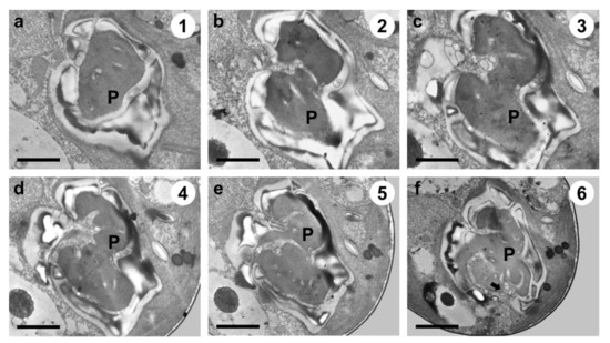 Serial TEM micrographs for the visualization of the pyrenoid matrix (P) of Tetraselmis jejuensis, which was penetrated by cytoplasmic channels (canaliculi) in various directions. The serial sections were obtained from the apical to the antapical direction in the cell. (a) The pyrenoid was encased in a starch sheath in the upper part. (b–e) It was invaded by canaliculi in the middle part. (f) Another penetration of cytoplasmic materials from a different direction was observed in the pyrenoid in the lower part (black arrow). The circled number in each micrograph indicates the section number in a series of sections. Scale bars = 1 µm.