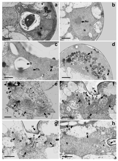 Magnified views of TEM micrographs of Tetraselmis jejuensis showing the position of cell organelles: (a) chloroplast (Ch) and pyrenoid (P); (b) nucleus (N) and nucleolus (No); (c) mitochondria (M), starch (S), and thylakoid membranes (Th); (d) Eyespot granules (E); (e–h) Flagellar apparatus of the cells; Flagella pit hairs (H), Golgi bodies (G), half-desmosome (Hd), rhizoplast (R), and basal bodies (black arrowheads). Scale bars = 1 µm for (a,b,d,f–h). Scale bars = 500 nm for (c) and (e).