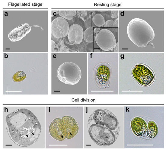 During periods of unfavorable conditions or reproduction, flagellated cells (Figure 8a,b) are transformed into resting cells, and cysts are displayed in the resting phase of the cell cycle. In SEM micrographs, these resting cells were encapsulated by a smooth theca with a short papilla and lost their flagella (Figure 8c–e). Under light microscopy, a non-motile cell without the four flagella was enclosed with a single or bilayer membrane showing a very small aperture (Figure 8f,g). In the process of vegetative reproduction, Tetraselmis jejuensis cells underwent asymmetric cell division, resulting in morphological differences between daughter cells and heterogeneity within clonal cells. The two pyrenoids separated by cell division showed asymmetric properties (Figure 8h,i). The protoplasts of two daughter cells transversely divided in the parent cell wall were different in morphology and ultrastructure (Figure 8j,k).