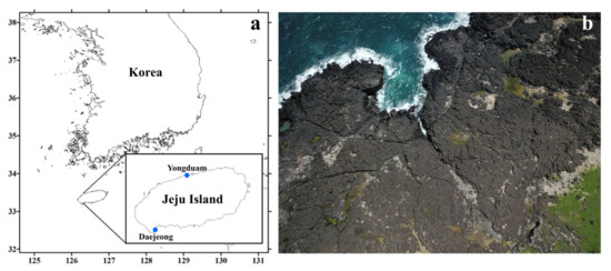 Location and aerial photographs of the sampling sites in Jeju Island. (a) Map of the sampling sites; location of Daejeong and Yongduam sites in Jeju Island. (b) The images show supralittoral tide pools made of basalt on the coastline of Jeju Island, Korea; images acquired using an unmanned aerial vehicle (UAV).