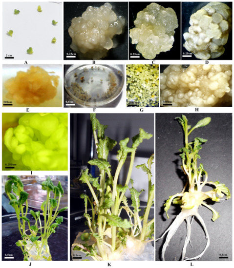 - Nasrin, F.; Khaleda, L.; Forkan, M.A. In vitro plant regeneration from callus of hypocotyls and cotyledonary explants of some indigenous mustard varieties. Indian J. Plant Sci. 2017, 6, 21–30. [Google Scholar]