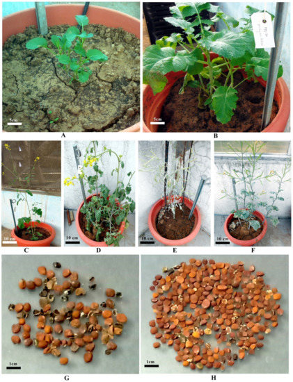 The response to callus induction applying 2,4-D was more pronounced in terms of type, nature, and color of callus proliferated. However, plant regeneration has not been obtained on a medium amended with 2,4-D alone from cultured immature seeds in optimum frequencies. Therefore, consecutively to augment shoot regeneration efficiency, callus cultures were subsequently inoculated on MS media fortified with BAP. Well growing callus cell lines of genotypes CS54 and PM30 were subjected to MS.5B (MS + 0.5 mg L−1 BAP) regeneration medium for shoot organogenesis (Table 1 and Table 2; Figure 1I–L). The present findings are supported by previous verdicts of Thakur et al. [38], Shyam et al. [31], Kumar and Srivastava [39], and Dhania and Singh [40] in mustard, Sharma et al. [41] in grape, Vibhute et al. [42] in Citrus species, and Mishra et al. [25] in soybean. However, in contrast to the present findings, multiple shoot formation in cotyledonary callus of Indian mustard (Brassica juncea cv. Prakash) was induced on modified MS media supplemented with a higher intensity of cytokinin viz., kinetin or zeatin, in combination with lower indole-3-acetic acid (IAA). Cytokinin BAP alone or in combination with auxins IAA or α-naphthalene acetic acid (NAA) did not support plantlet regeneration [16]. Plantlets acquired from cell lines of genotypes CS54 and PM30 were transferred under greenhouse conditions (Figure 2A,B), followed by polyhouse (Figure 2C,D) for hardening, before transferring under field conditions (Figure 2E,F), and the seeds were harvested after maturity (Figure 2G,H), and subsequently, the R1 generation was obtained from the growing Ro generation.
