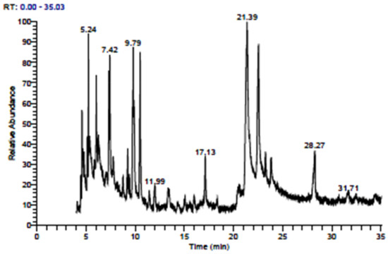 Fatty acid profile analysis of somaclones derived from callus cultures of genotype PM30 (Table 7 and Figure 4) also revealed variation in different fatty acid contents. A total of 27 fatty acid compounds were detected clustered into seven groups based on RT (retention time). The highest percentage (25.36%) was evidenced for Glycidyl oleate, 9-Octadecenoic acid (Z)-, 2-hydroxy-1-(hydroxymethyl) ethyl ester with 9-Octadecenoic acid, 1,2,3-propanetriyl ester, (E, E, E) eluted at 21.39 RT, while the lowest content (1.62%) was recorded for 1-Heptacosanol, Hexacosylpentafluoropropionate, Hexacosyl heptafluorobutyrate, 17-Pentatriacontene, Oleic acid, 3-(octadecyloxy) propyl ester, and Octadecane, 3-ethyl-5-(2-ethyl butyl) expressed at 11.99 RT. These fatty acids were further categorized for a particular acid found in mustard oil and presented in Table 8. The complete absence of erucic acid was detected in putative somaclone R0 and R1 generations regenerated from callus and cell suspension cultures of genotype PM30 despite its presence (1.07%) in the mother plant. Although palmitic and oleic acid ratios considerably increased in R0 and R1 generations of putative somaclones compared to mother plants. Conforming findings have also been reported by Jagannath et al. [44], who observed a decrease in erucic acid content, enhancing the oleic acid, giving a better ratio of linoleic and linolenic acids. Afterward, in Indian mustard oil, Singh et al. [5] reported that the trait high erucic acid content was partially dominant over low erucic acid content and emphasized that selection for low erucic acid would result in isolation of plants with high oleic and linoleic acids. Hence, it should be convincing to advance high oleic acid lines having low erucic acid content in mustard. A total of 11 double low lines were selected from a pool of 1200 lines in F7 generation by Priyamedha et al. [9]. Amongst the selected lines, two viz., BPRQ-2-1-5 and BPRQ-2-2-11, were found to be exceedingly auspicious in terms of oil quality and yield performance. They also reported a negative and significant correlation between oleic and erucic acid, indicating the possibility of reducing the erucic acid content by enhancing oleic acid using an increased breeding intensity and potential donors. Sequence-tagged microsatellite site (STMS) analysis of canola variety ‘Heera’ and a high yielding popular one ‘Kranti’, clearly distinguished quality and non-quality lines. Seeds of interspecific hybrids obtained from the ovule culture of crosses between B. junceia and B. napus had a fatty acid profile different from parental values, mainly for oleic and erucic acids. The low oleic acid (13%) in B. juncea increased to 23–26% in hybrids, and high erucic acid in B. juncea (41%) declined to 21–23% among hybrids. Linoleic and linolenic acids showed slight variation from parental values. The fatty acid profile of F1 hybrids shifted towards that of canola quality. The F2 seeds had zero erucic acid and high oleic acid, similar to or exceeding the canola parent. Successful interspecific hybridization of B. juncea and B. napus was confirmed by altered FAP and molecular markers [18]. Low erucic varieties of B. juncea showed an increase in oleic and linoleic acid content, while double zero varieties of B. napus showed a proportional increase in oleic acid content and reduced erucic acid content [10]. In the present investigation, low erucic acid has been evidenced from R0 and R1 generations of putative somaclones of both genotypes. It occurred perhaps due to the metabolic pathway of erucic acid synthesis, as immature cotyledons and seeds have taken as explants sources, and plantlets were regenerated from cell lines derived from these explants.
