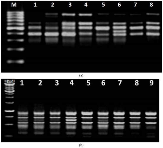 Electrophoretic banding pattern of the mother, as well as putative somaclone plants of (a) CS54, amplified with OPA-12 RAPD primer, Lane 1: Mother plant, Lane 2–8: Putative somaclones, M-1 kb ladder, (b) PM30, amplified with OPM-13 RAPD primer. Lane 1: Mother plant, Lane 2–9: Putative somaclones, M-1 kb ladder.