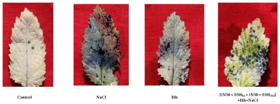 Salt stress brought about ROS overproduction in plants. The enhanced concentration of ROS led to oxidative damage in the mustard plants, with increased lipid peroxidation and damage to cell membranes. The generatedO2•− level in leaves was assessed using NBT as a histochemical process. The level of generated O2•− was viewed through blue staining 6 h after treatment of leaves with NBT. The stained spots were more conspicuous in salt-treated leaf discs, compared to control leaves. Ethephon in the salt-treated plants decreased the O2•− spots, compared to plants receiving the salt-alone treatment. Plants with ethephon added to split dosage of N and S showed only limited staining under salt treatment, compared to the NaCl-treated plants (Figure 2).