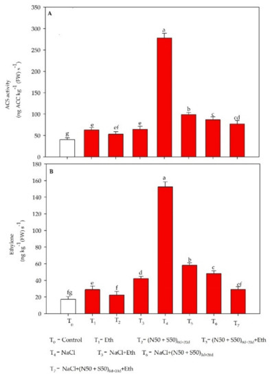 The results also showed that salt stress decreases chlorophyll content, which agrees with previous reports for Vigna radiata [65] and Medicago sativa seedlings [94]. Application of Eth plus N and S increased chlorophyll content and led to active photosynthetic activity, causing growth. Photosynthesis is directly related to crop production under several metabolic processes [93]; an ineffective photosynthetic capacity will lead to yield loss under stress [94].