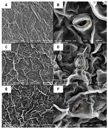 Stomatal behavior of mustard examined under (A,B) control, (C,D) 100 mM NaCl, and (E,F) ETH treatment with split doses of N and S with 100 mM NaCl. The stomatal response of opening and closing was viewed with SEM at 500 × (A,C,E) and 3000 × (B,D,F) magnification in mustard plants developed under 100 mM NaCl at 40 DAS. Bars (A,C,E) = 50 µm; bars (B,D,F) = 5 µm.