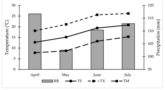 Monthly meteorological data from April to July 2014 for the Novo Mesto meteorological station. Data were obtained from the Environmental Agency of the Republic of Slovenia (ARSO, 2014). TS, mean monthly air temperature; TX, mean daily maximum temperature; TM, mean daily minimum temperature; RR, precipitation.