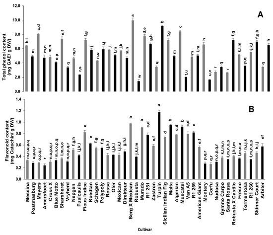 Total phenolic (A) and flavonoid (B) contents of cladodes from 42 spineless cactus pear cultivars. Bars bearing different letters in each graph are significantly different (p = 0.05) according to Duncan’s Multiple Range Test (DMRT). Values are mean ± standard errors (n = 3). GAE—Gallic Acid Equivalents.