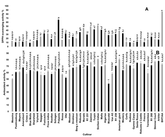 Antioxidant activity of cladode methanolic extracts from 42 spineless cactus pear cultivars. (A) DPPH free radical scavenging activity (%) at 10 mg/mL extract concentration. (B) Antioxidant activity (%) based on bleaching rate in β-carotene-linoleic acid assay. Bars bearing different letters in each graph indicate significant differences (p = 0.05) according to Duncan’s Multiple Range Test (DMRT). Values are means ± standard errors (n = 3). Butylated hydroxytoluene (BHT) was used as a standard for total antioxidant activity while ascorbic acid (AA) was used as a standard for DPPH free radical scavenging activity.