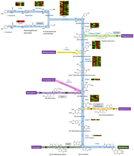 - Muemmler, S.; Rueffer, M.; Nagakura, N.; Zenk, M.H. S-adenosyl-L-methionine: (S)-scoulerine 9-O-methyltransferase, a highly stereo- and regio-specific enzyme in tetrahydroprotoberberine biosynthesis. Plant Cell Rep. 1985, 4, 36–39. [Google Scholar] [CrossRef][Green Version]