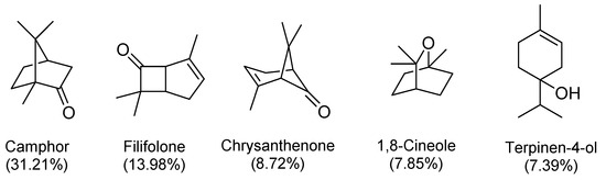 The major constituents of the EO were found to be the hydrocarbons and oxygenated monoterpenes amounting to 84.64%, of which the oxygenated monoterpenes were dominant by 76.49%. The only identified sesquiterpene was found to be caryophyllene oxide present as 0.45%. No hydrocarbon sesquiterpenes were detected. The major constituents were found to be oxygenated monoterpenes: camphor (31.21%), filifolone (13.98%), chrysanthenone (8.72%), 1,8-cineole (7.85%), and terpinen-4-ol (7.39%) (Figure 2).
